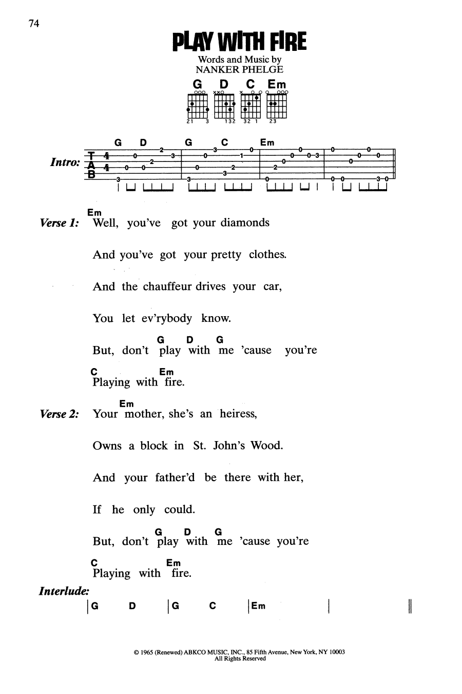 Download or print The Rolling Stones Play With Fire sheet music, chords and digital score arranged for Guitar Chords/Lyrics. This Rock score includes 2 page(s).