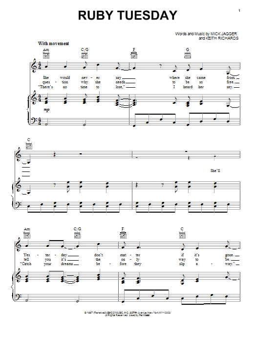 Download or print The Rolling Stones Ruby Tuesday sheet music, chords and digital score arranged for Piano, Vocal & Guitar Chords (Right-Hand Melody). This Pop score includes 4 page(s).