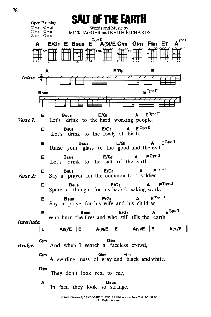 Download or print The Rolling Stones Salt Of The Earth sheet music, chords and digital score arranged for Guitar Chords/Lyrics. This Pop score includes 3 page(s).