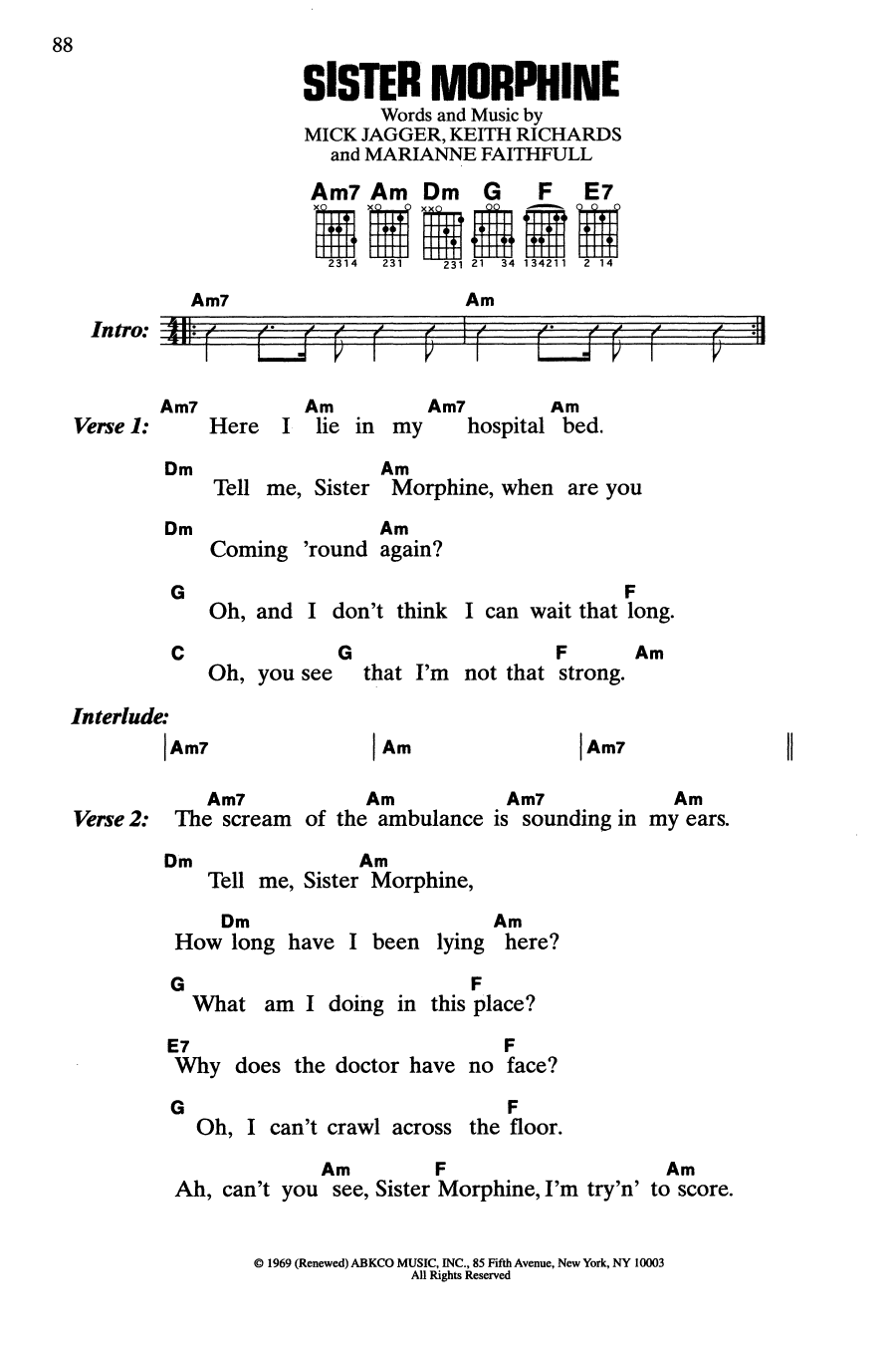Download or print The Rolling Stones Sister Morphine sheet music, chords and digital score arranged for Guitar Chords/Lyrics. This Rock score includes 2 page(s).