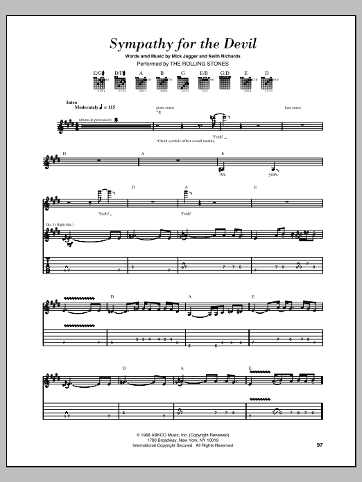 Download or print The Rolling Stones Sympathy For The Devil sheet music, chords and digital score arranged for Guitar Tab. This Pop score includes 13 page(s).