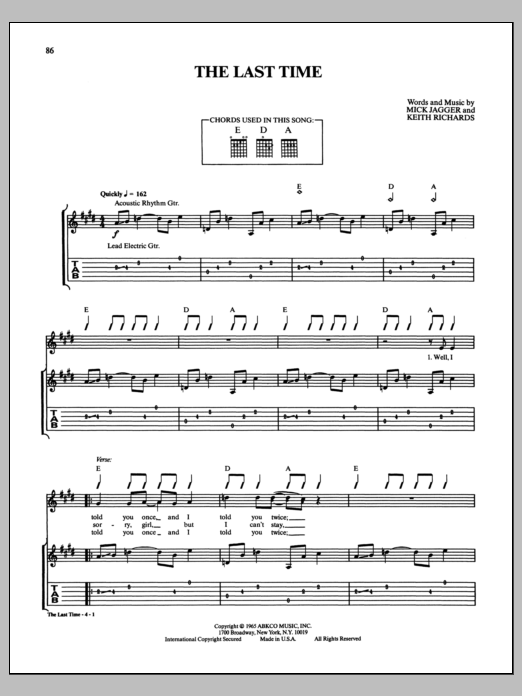 Download or print The Rolling Stones The Last Time sheet music, chords and digital score arranged for Guitar Chords/Lyrics. This Rock score includes 2 page(s).