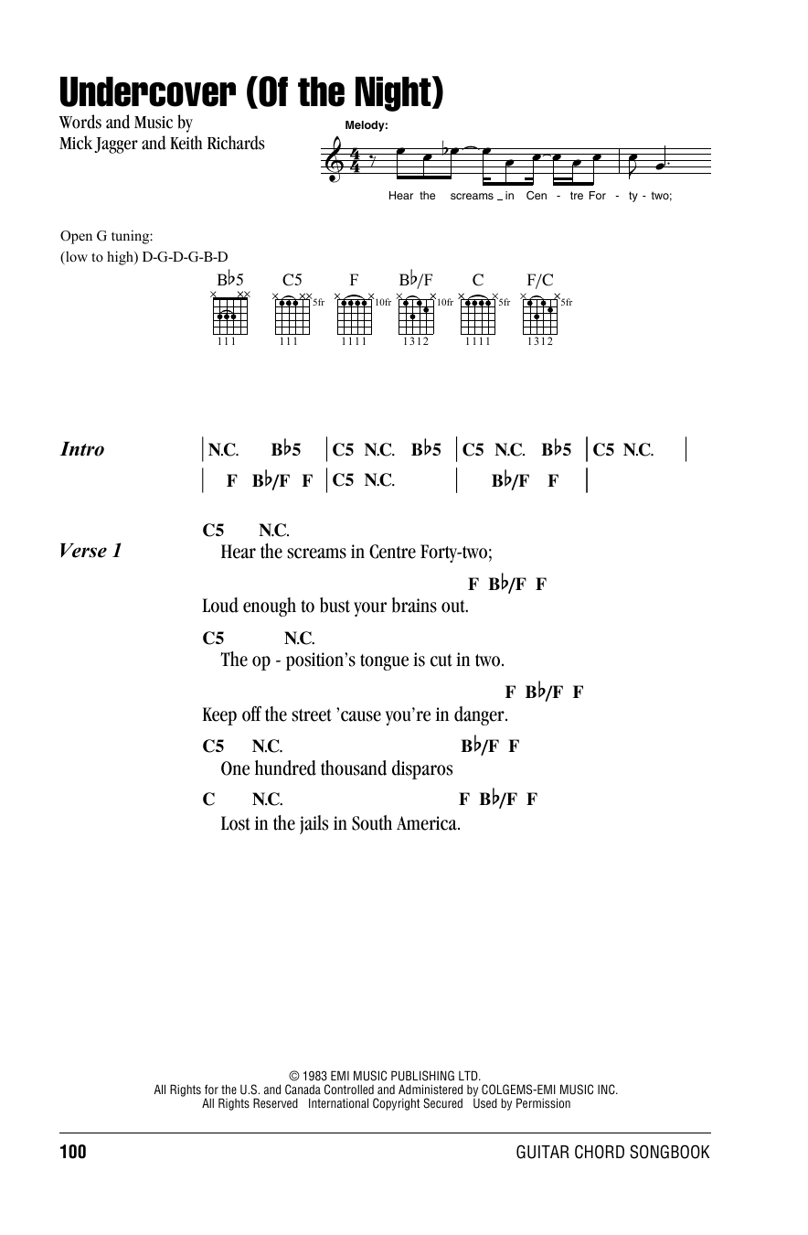 Download or print The Rolling Stones Undercover (Of The Night) sheet music, chords and digital score arranged for Guitar Tab. This Pop score includes 14 page(s).