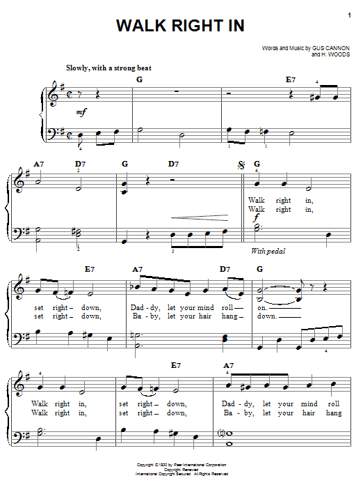 Download or print The Rooftop Singers Walk Right In sheet music, chords and digital score arranged for Easy Piano. This Pop score includes 2 page(s).