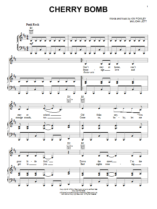 Download or print The Runaways Cherry Bomb sheet music, chords and digital score arranged for Piano, Vocal & Guitar Chords (Right-Hand Melody). This Metal score includes 4 page(s).