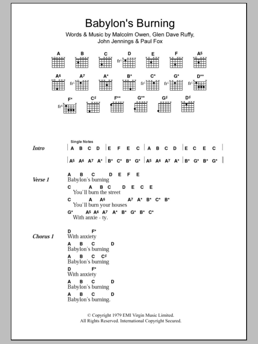 Download or print The Ruts Babylon's Burning sheet music, chords and digital score arranged for Guitar Chords/Lyrics. This Rock score includes 3 page(s).