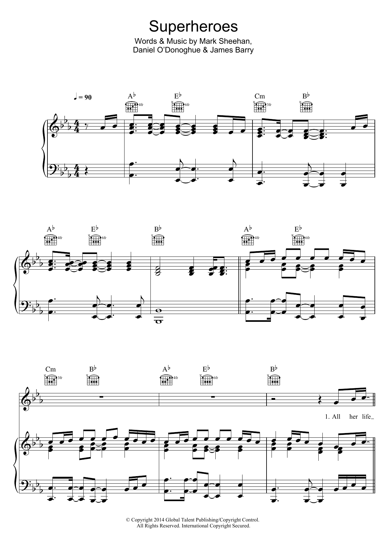 Download or print The Script Superheroes sheet music, chords and digital score arranged for Piano, Vocal & Guitar Chords (Right-Hand Melody). This Pop score includes 7 page(s).