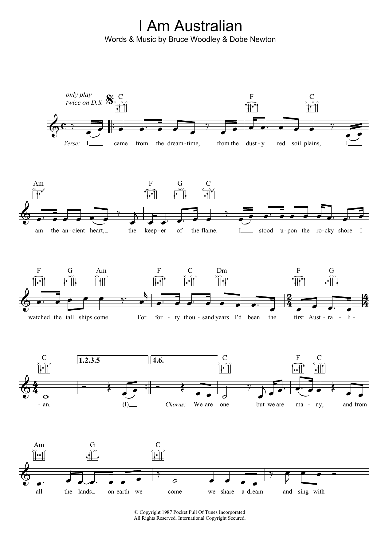 Download or print The Seekers I Am Australian sheet music, chords and digital score arranged for Piano, Vocal & Guitar Chords (Right-Hand Melody). This Pop score includes 3 page(s).