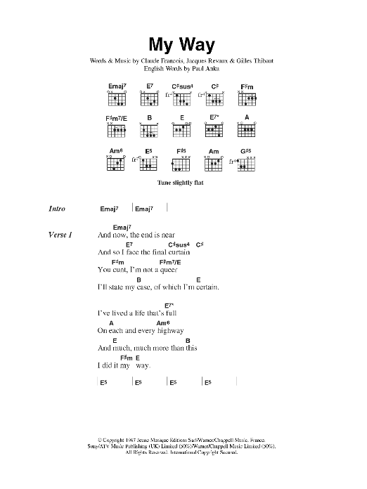 Download or print The Sex Pistols My Way sheet music, chords and digital score arranged for Guitar Chords/Lyrics. This Rock score includes 3 page(s).