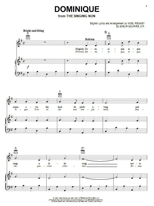Download or print The Singing Nun Dominique sheet music, chords and digital score arranged for Lead Sheet / Fake Book. This Film/TV score includes 1 page(s).
