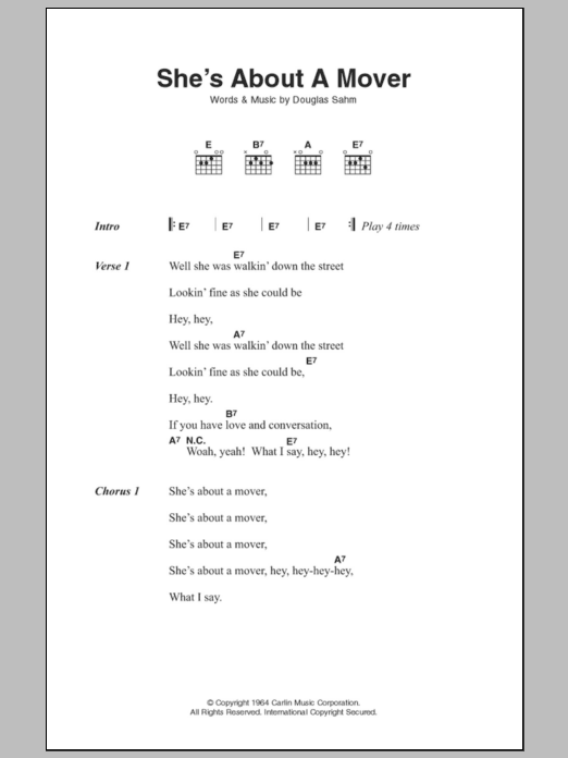 Download or print The Sir Douglas Quintet She's About A Mover sheet music, chords and digital score arranged for Guitar Chords/Lyrics. This Rock score includes 2 page(s).