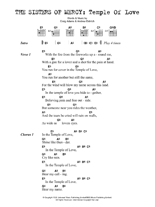 Download or print The Sisters Of Mercy Temple Of Love sheet music, chords and digital score arranged for Guitar Chords/Lyrics. This Rock score includes 4 page(s).