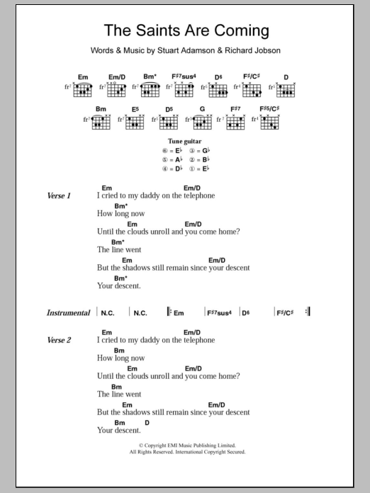Download or print The Skids The Saints Are Coming sheet music, chords and digital score arranged for Guitar Chords/Lyrics. This Rock score includes 3 page(s).