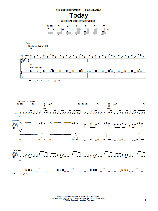 Download or print The Smashing Pumpkins Today sheet music, chords and digital score arranged for Guitar Tab. This Alternative score includes 7 page(s).