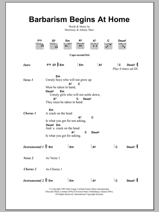 Download or print The Smiths Barbarism Begins At Home sheet music, chords and digital score arranged for Guitar Chords/Lyrics. This Rock score includes 2 page(s).