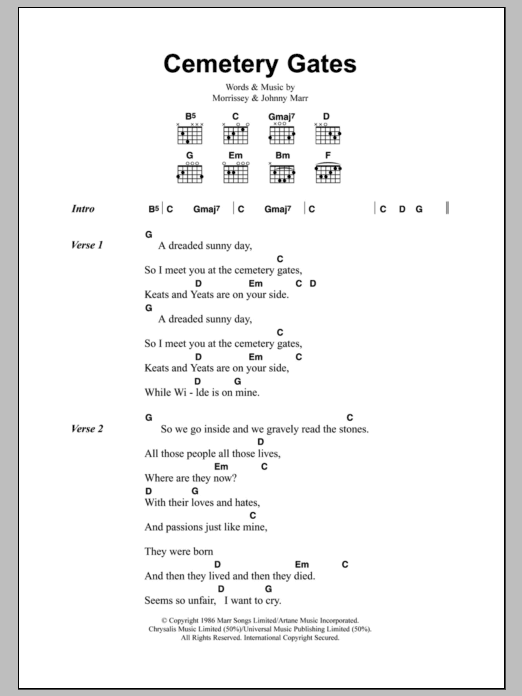Download or print The Smiths Cemetry Gates sheet music, chords and digital score arranged for Guitar Chords/Lyrics. This Rock score includes 3 page(s).