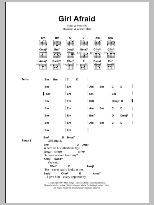Download or print The Smiths Girl Afraid sheet music, chords and digital score arranged for Guitar Chords/Lyrics. This Rock score includes 2 page(s).