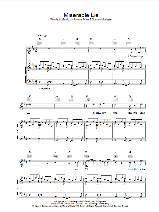 Download or print The Smiths Miserable Lie sheet music, chords and digital score arranged for Guitar Chords/Lyrics. This Rock score includes 3 page(s).