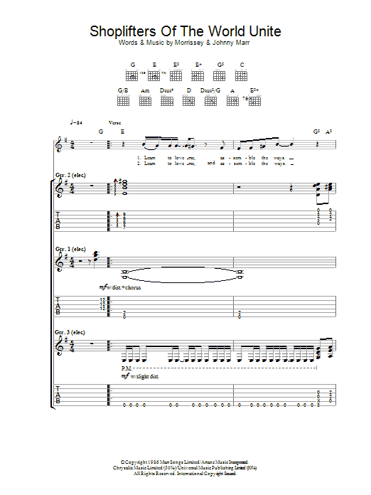 Download or print The Smiths Shoplifters Of The World Unite sheet music, chords and digital score arranged for Guitar Chords/Lyrics. This Rock score includes 2 page(s).