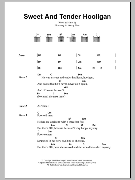Download or print The Smiths Sweet And Tender Hooligan sheet music, chords and digital score arranged for Guitar Chords/Lyrics. This Rock score includes 3 page(s).