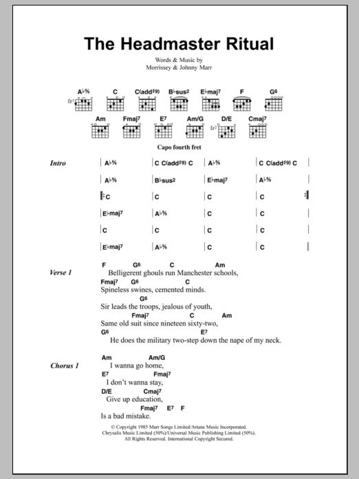 Download or print The Smiths The Headmaster Ritual sheet music, chords and digital score arranged for Guitar Chords/Lyrics. This Rock score includes 3 page(s).