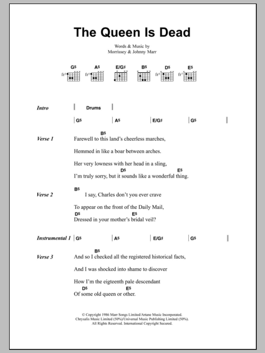 Download or print The Smiths The Queen Is Dead sheet music, chords and digital score arranged for Guitar Chords/Lyrics. This Rock score includes 4 page(s).