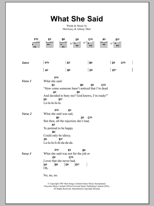 Download or print The Smiths What She Said sheet music, chords and digital score arranged for Guitar Chords/Lyrics. This Rock score includes 2 page(s).