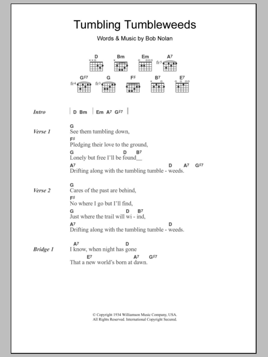 Download or print The Sons Of Pioneers Tumbling Tumbleweeds sheet music, chords and digital score arranged for Guitar Chords/Lyrics. This Country score includes 2 page(s).