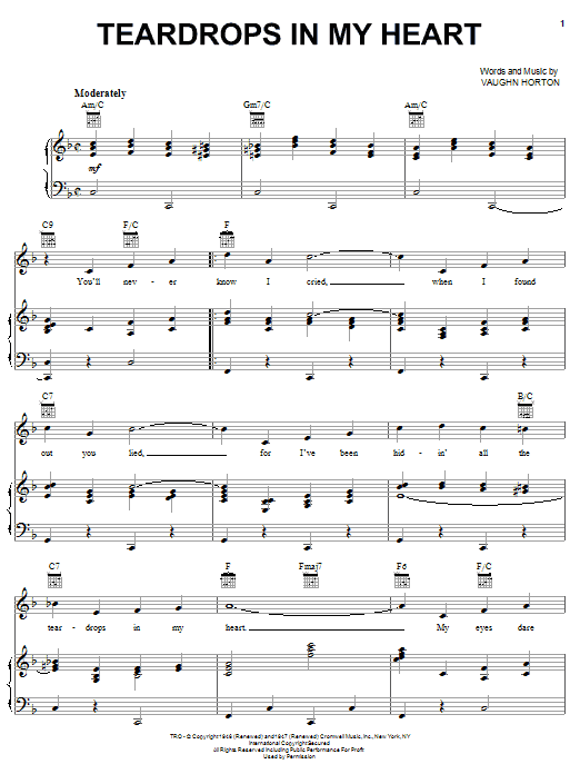 Download or print The Sons Of The Pioneers Teardrops In My Heart sheet music, chords and digital score arranged for Piano, Vocal & Guitar Chords (Right-Hand Melody). This Country score includes 3 page(s).
