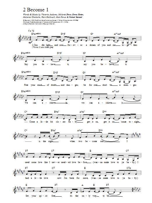 Download or print The Spice Girls 2 Become 1 sheet music, chords and digital score arranged for Piano & Vocal. This Pop score includes 5 page(s).