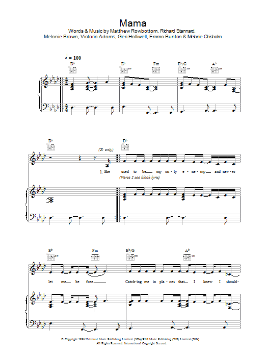 Download or print The Spice Girls Mama sheet music, chords and digital score arranged for Piano, Vocal & Guitar Chords (Right-Hand Melody). This Love score includes 6 page(s).