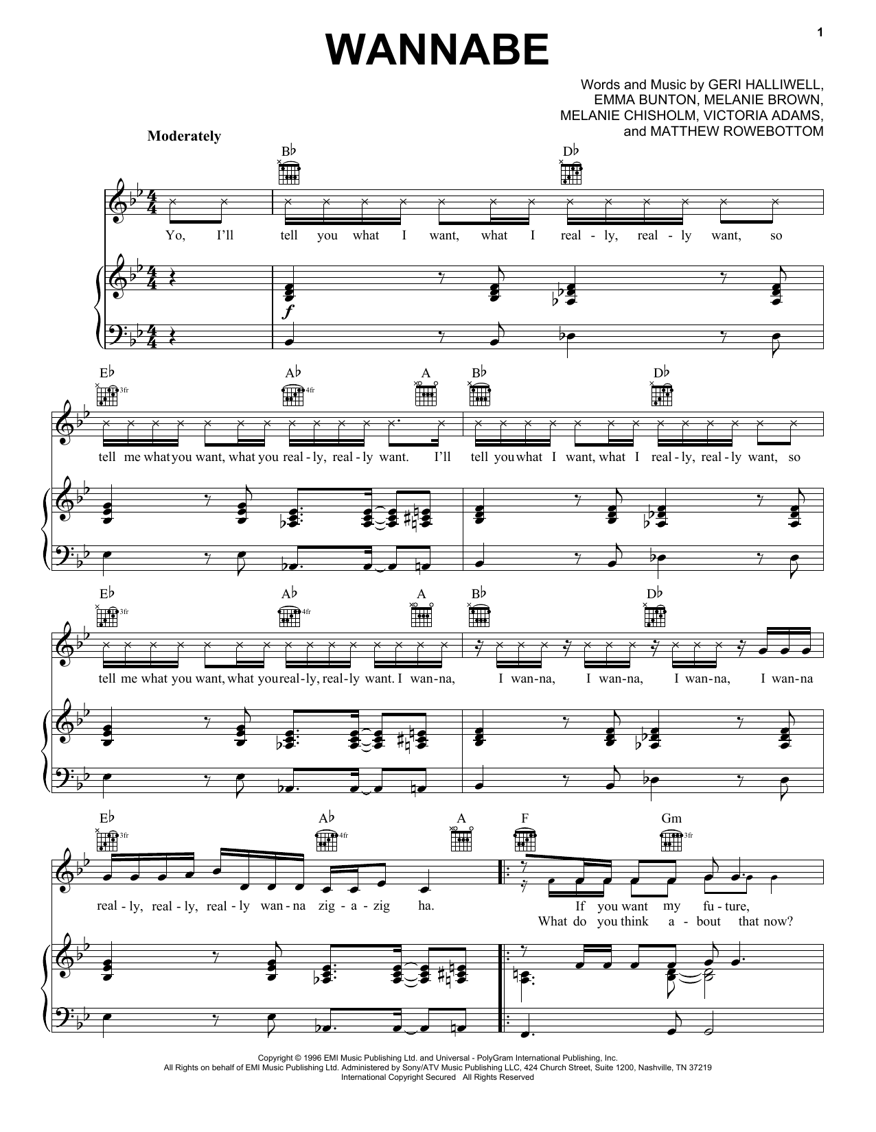 Download or print Spice Girls Wannabe sheet music, chords and digital score arranged for Piano, Vocal & Guitar Chords (Right-Hand Melody). This Disco score includes 4 page(s).
