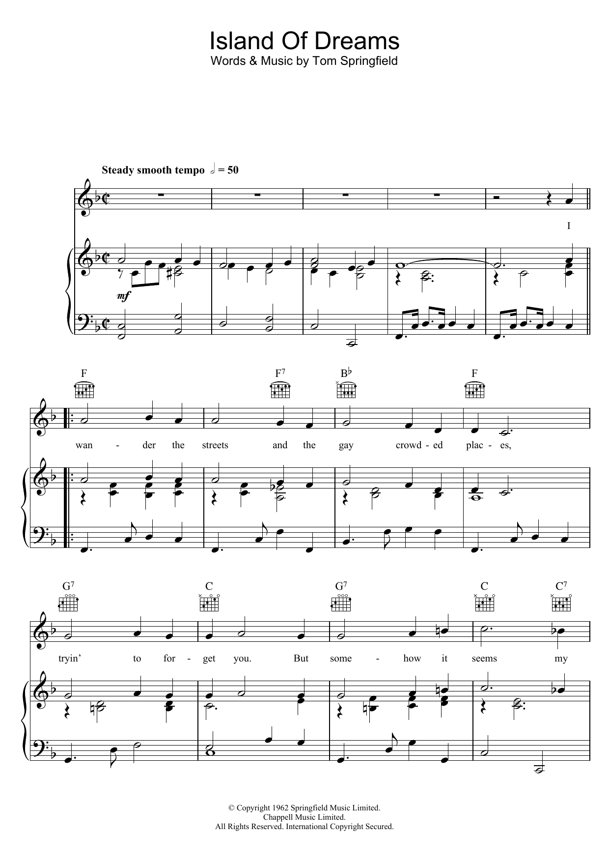 Download or print The Springfields Island Of Dreams sheet music, chords and digital score arranged for Piano, Vocal & Guitar Chords. This Standards score includes 3 page(s).