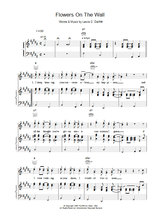 Download or print The Statler Brothers Flowers On The Wall sheet music, chords and digital score arranged for Guitar Chords/Lyrics. This Country score includes 2 page(s).