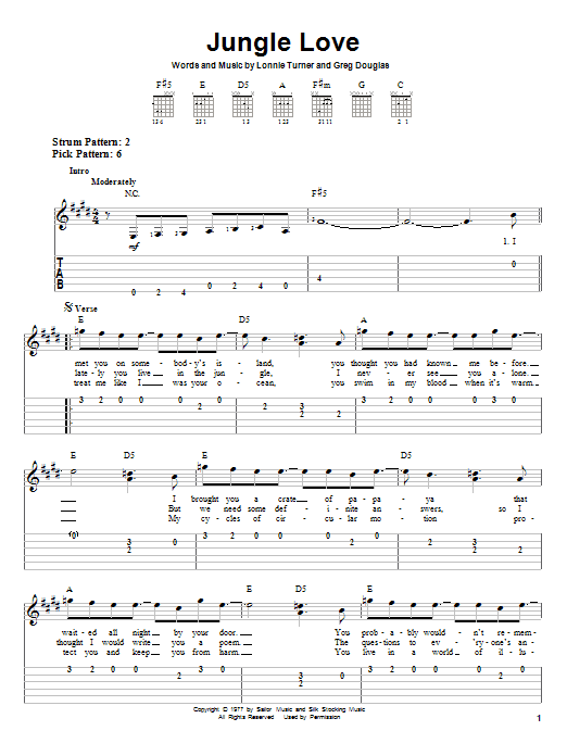 Download or print Steve Miller Band Jungle Love sheet music, chords and digital score arranged for Guitar Tab (Single Guitar). This Pop score includes 5 page(s).