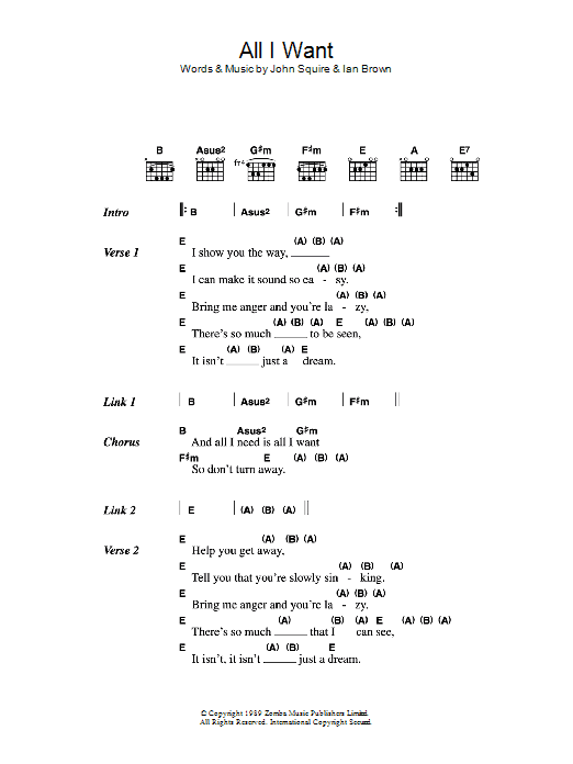 Download or print The Stone Roses All I Want sheet music, chords and digital score arranged for Guitar Chords/Lyrics. This Rock score includes 2 page(s).