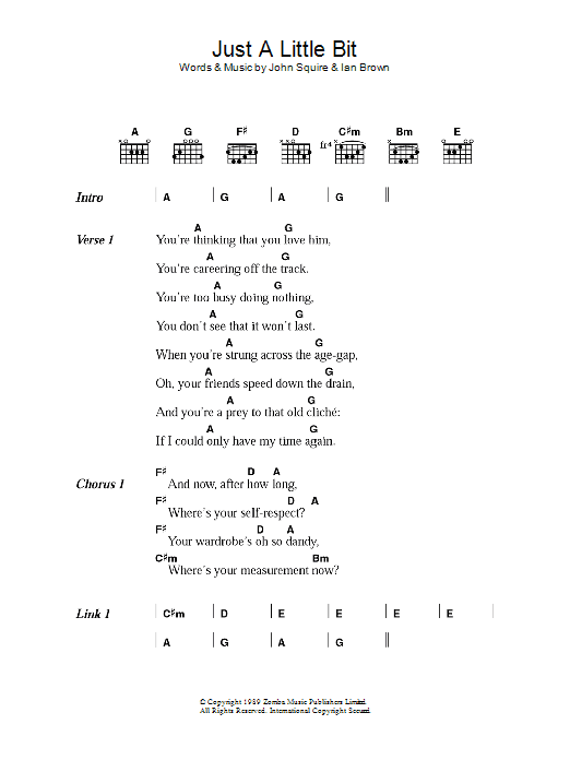 Download or print The Stone Roses Just A Little Bit sheet music, chords and digital score arranged for Guitar Chords/Lyrics. This Rock score includes 2 page(s).