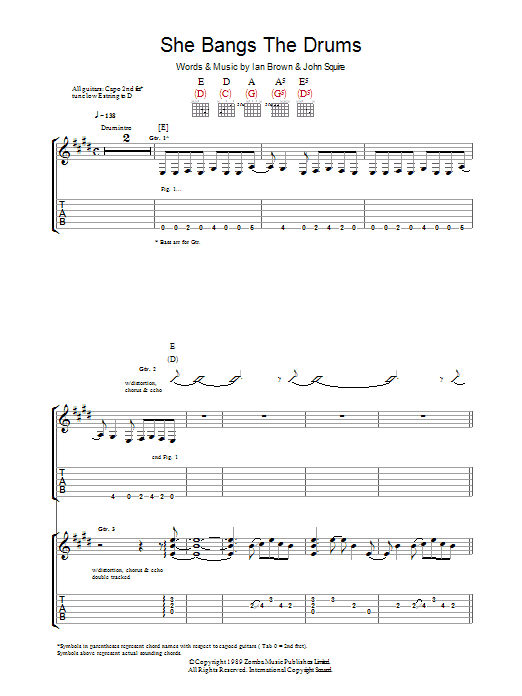 Download or print The Stone Roses She Bangs The Drums sheet music, chords and digital score arranged for Guitar Tab. This Rock score includes 9 page(s).