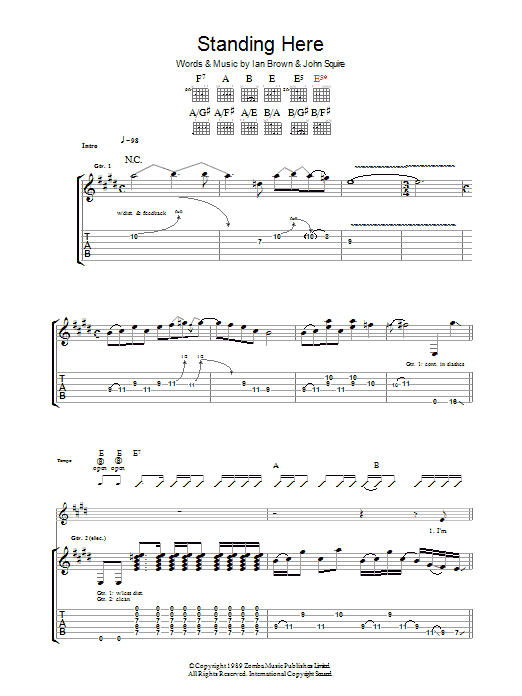 Download or print The Stone Roses Standing Here sheet music, chords and digital score arranged for Guitar Tab. This Rock score includes 13 page(s).