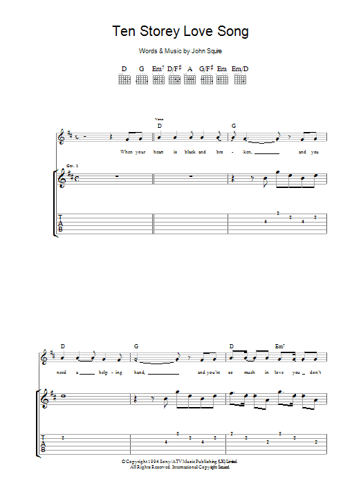 Download or print The Stone Roses Ten Storey Love Song sheet music, chords and digital score arranged for Guitar Chords/Lyrics. This Rock score includes 2 page(s).