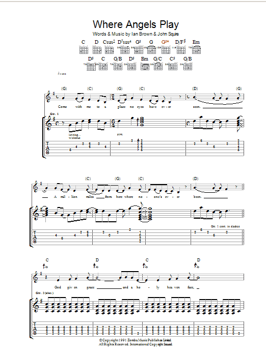 Download or print The Stone Roses Where Angels Play sheet music, chords and digital score arranged for Guitar Tab. This Rock score includes 6 page(s).