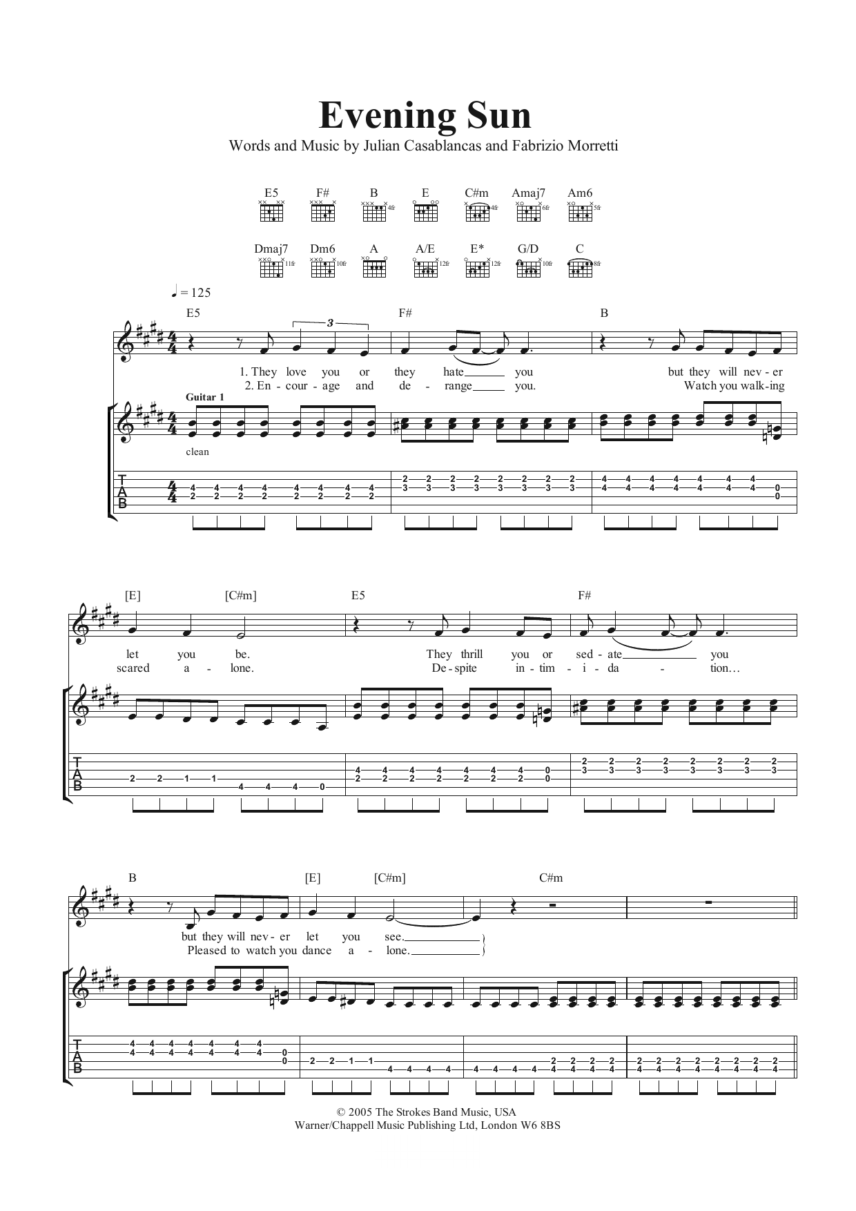 Download or print The Strokes Evening Sun sheet music, chords and digital score arranged for Guitar Tab. This Rock score includes 7 page(s).