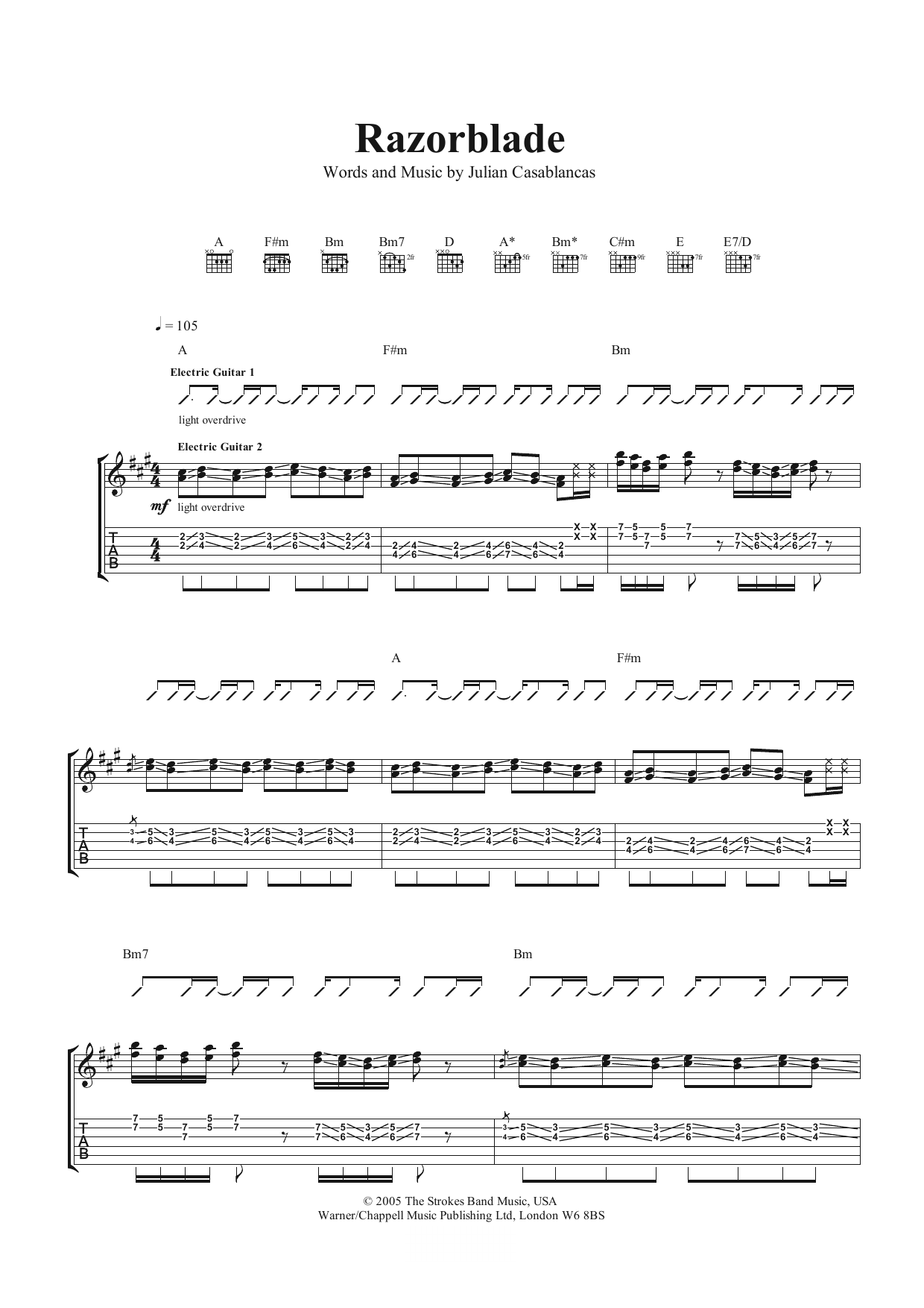 Download or print The Strokes Razorblade sheet music, chords and digital score arranged for Guitar Tab. This Rock score includes 7 page(s).