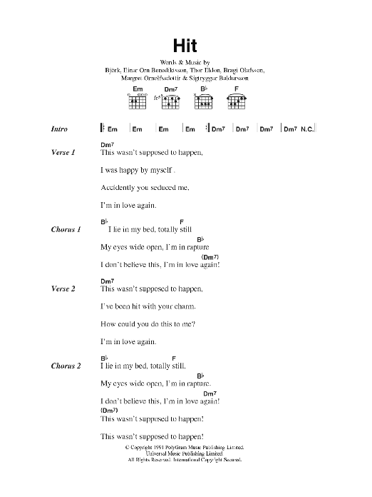 Download or print The Sugarcubes Hit sheet music, chords and digital score arranged for Guitar Chords/Lyrics. This Rock score includes 2 page(s).