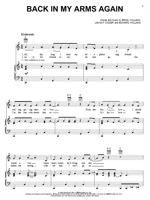 Download or print The Supremes Back In My Arms Again sheet music, chords and digital score arranged for Piano, Vocal & Guitar Chords (Right-Hand Melody). This Oldies score includes 3 page(s).