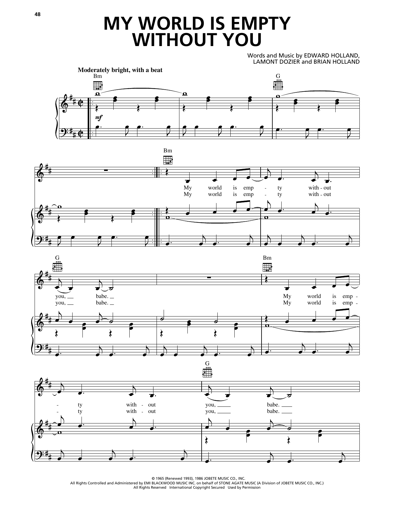 Download or print The Supremes My World Is Empty Without You sheet music, chords and digital score arranged for Piano, Vocal & Guitar Chords (Right-Hand Melody). This Pop score includes 6 page(s).
