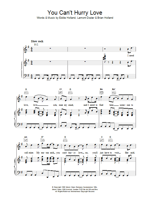 Download or print The Supremes You Can't Hurry Love sheet music, chords and digital score arranged for Easy Piano. This Soul score includes 6 page(s).