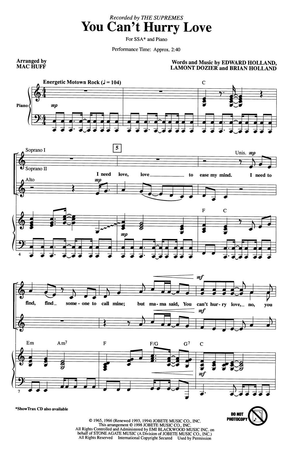 Download or print The Supremes You Can't Hurry Love (arr. Mac Huff) sheet music, chords and digital score arranged for SSA Choir. This Oldies score includes 10 page(s).