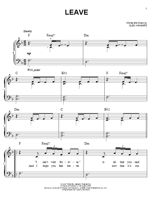 Download or print The Swell Season Leave sheet music, chords and digital score arranged for Easy Guitar Tab. This Film/TV score includes 4 page(s).