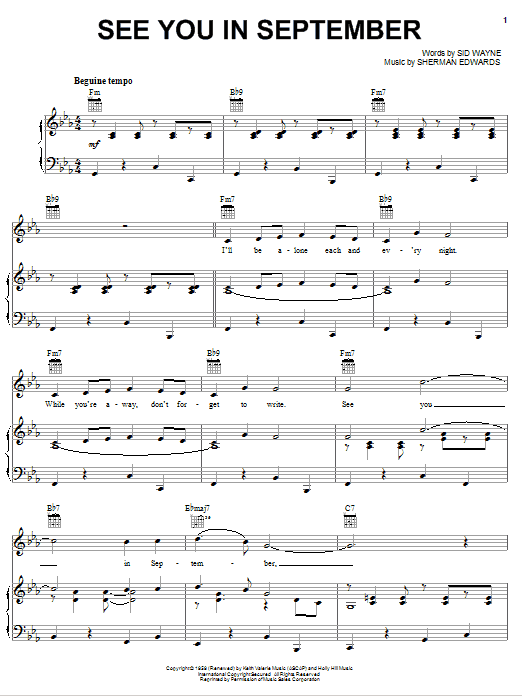 Download or print The Tempos See You In September sheet music, chords and digital score arranged for Piano, Vocal & Guitar Chords (Right-Hand Melody). This Oldies score includes 4 page(s).